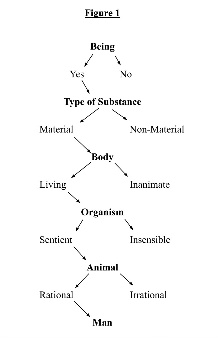 These questions can be placed upon a chart (see figure 1 below) to help us see the flow and to map out the base nature of any particular thing. Each time a person can answer in the affirmative to these questions as he moves down the list this is called a note in logic. If, for instance, a “table” is under consideration we may ask whether or not it has being (i.e. do tables exist)? Yes (1 Note). Are tables material beings? Yes (2 Notes). Are tables living? No. There is no need to continue with the other two questions at this point because no non-living thing can be sentient or rational. So, of a table’s base nature we may say it has two notes because it is a non-living, material being. A simple definition of a table, then, is “a non-living material being.” The phrase “non-living” is not considered a note but is included in our final answer because it tells us where we came to a “dead-end” on the Porphyrian Tree.